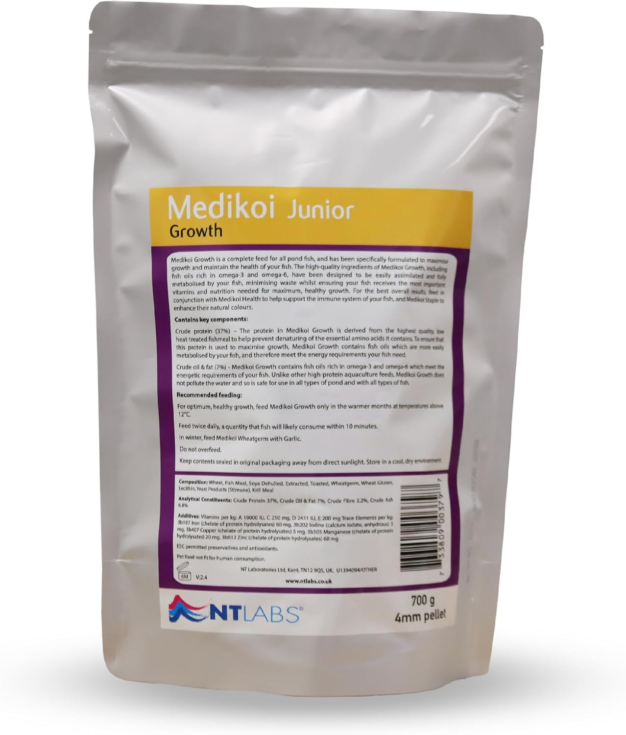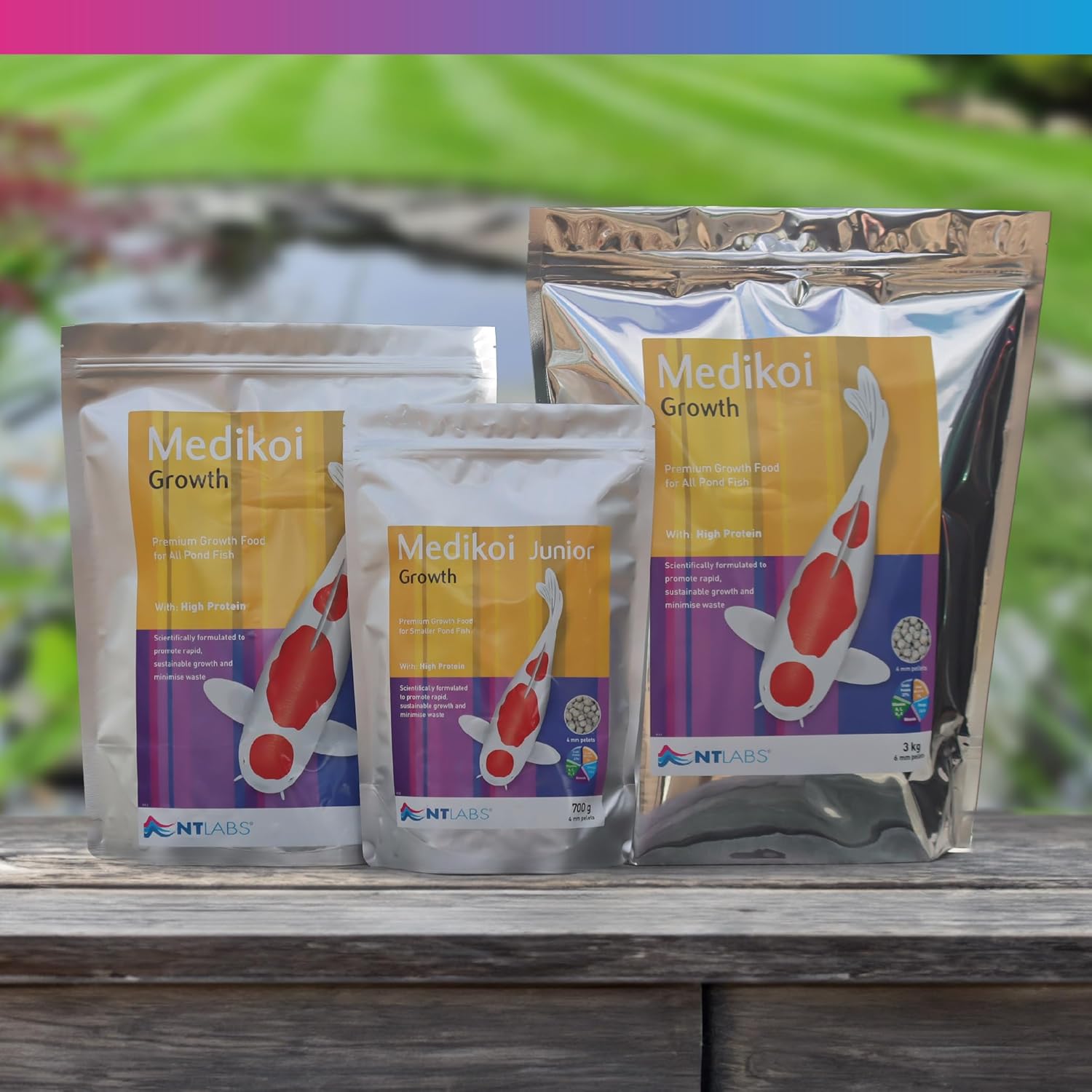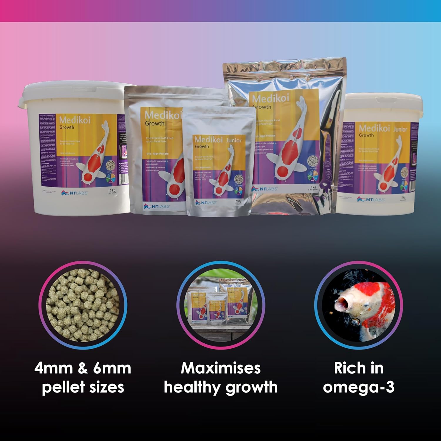 NT Labs Medikoi Growth is a complete feed for all pond fish. Furthermore it has been specifically formulated to enhance the growth rate of your fish whilst maintaining the health of your fish. The high-quality ingredients of this food, including fish oils rich in omega-3 and omega-6, have been designed to be easily assimilated and fully metabolised by your fish. This also minimises waste whilst ensuring your fish receives the most important vitamins and nutrition needed for maximum, healthy growth. Feed in conjunction with Medikoi Health for the best overall results. This helps support the immune system of your fish, and Medikoi Staple with Colour Enhancer to enhance their natural colours.
