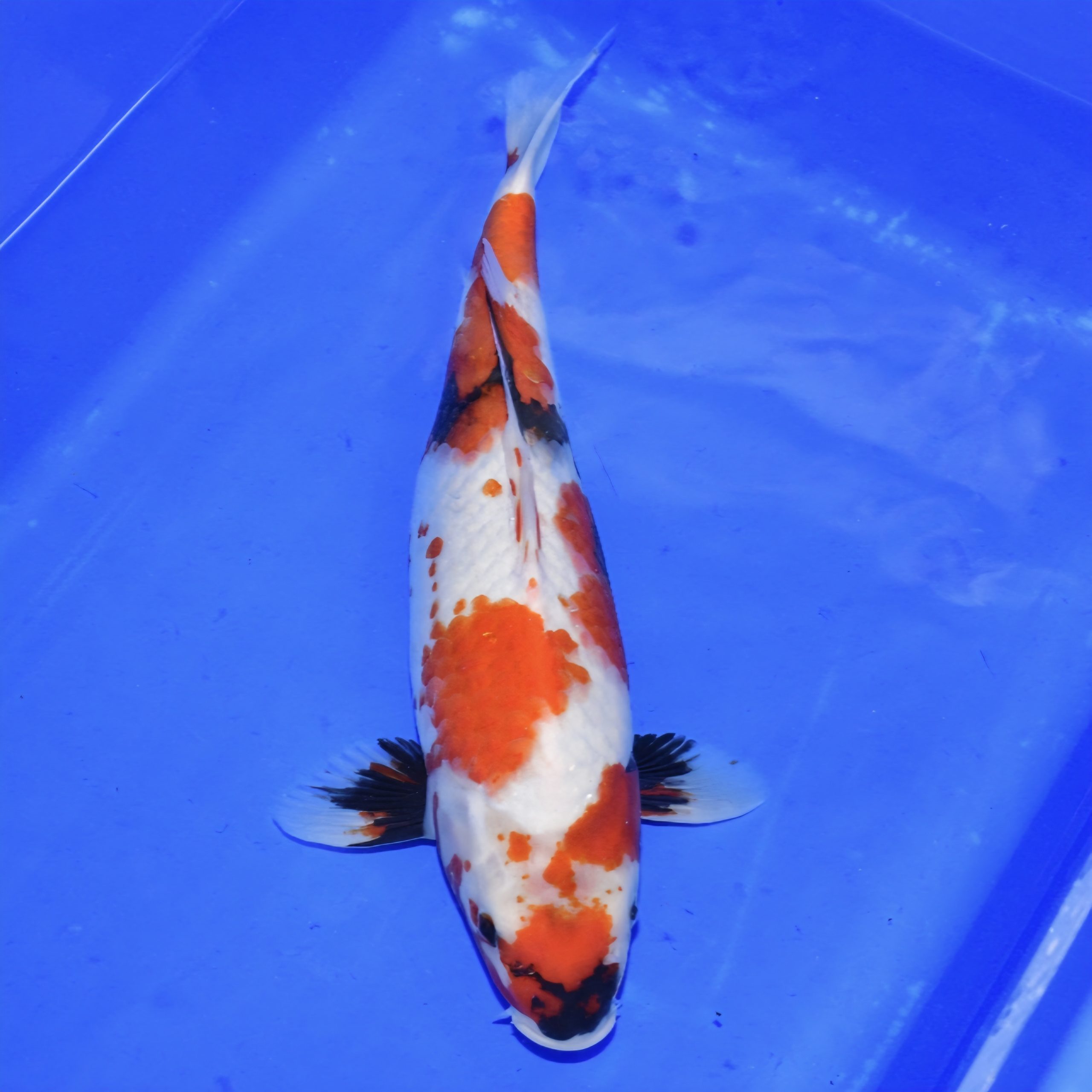 A Showa is a koi that display white and red/orange patterns over top of a black base color.In Showa, the black patterns will wrap all the way around the body, instead of appearing only on the top half of the body. Also, Showa will have black patterns on the head, and Sanke will not.Variations of Showa include Tancho Showa, Maruten Showa, Gin Rin Showa, Doitsu Showa and Kin Showa